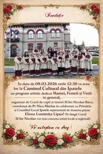 La Căminul Cultural din Ipatele, începând cu ora 12.30, va avea loc un program artistic dedicat mamei, femeii și vieții în general, organizat de Corul de copii și tineret „Sfântul Ierarh Nicolae” – Bâcu, coordonat de părintele Marius Nica, în colaborare cu Primăria și Consiliul Local Ipatele, reprezentate de doamna primar Elena Luminița Lipșa. Pe lângă Corul „Sfântul Ierarh Nicolae” vor mai concerta artiști locali și regionali.
